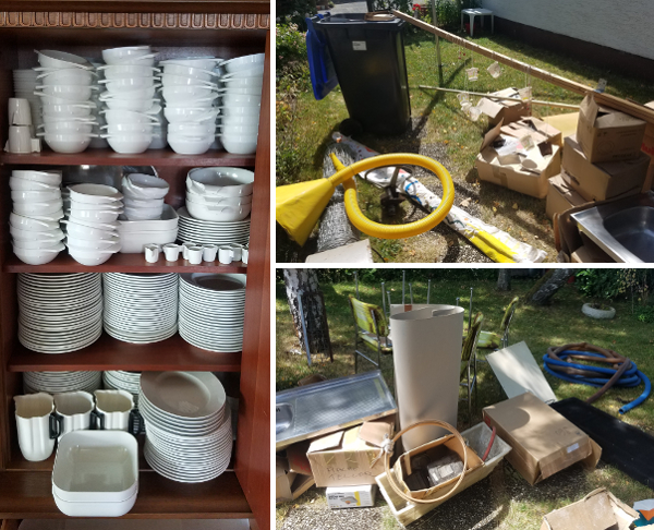 Und dann Kisten über Kisten mit Melamingeschirr – für Parties von bis zu 90 Gästen. Flache Teller, tiefe Teller, Kompottteller, Suppenschalen… Ich hatte das vorher noch nie gesehen, es waren Werbeprospekte mit DM-Preisen in den Kisten – und alle kamen vom Katastrophenschutz. Gab’s vielleicht mal einen Tag der offenen Tür am Bunker, wo man sich mit Dingen eindecken konnte, die man da loswerden wollte? Wie gesagt, der Hausflohmarkt wächst: