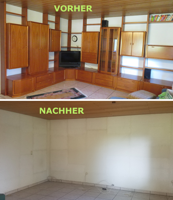 Nun geht es auch im Haus in die nächste Phase: sechs Wochen oder so habe ich versucht, die Schrankwand im Wohnzimmer zu verkaufen – ohne Erfolg. Am letzten Wochenende haben wir sie dann abgebaut. Dabei stellte sich heraus, dass ich auch wieder einen Elektriker kommen lassen muss, denn bspw. ein Kabel aus der Wand, das per Lüsterklemmen zu einer Dreiersteckdose wird, soll dann doch nicht die Hauptstromversorgung im Wohnzimmer schultern. Am Freitag werden erste Arbeiten für den Kaminofen gemacht (Schornstein u.a.). Und DANN kann es an das „Schönmachen“ gehen 🙂