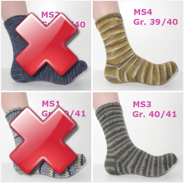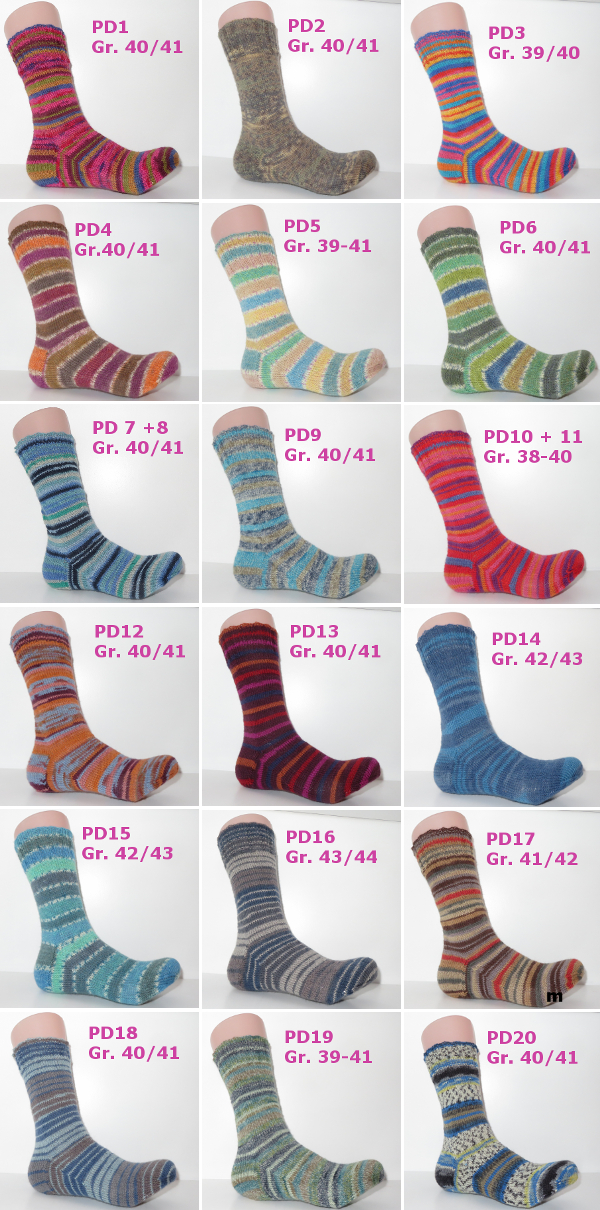 Gerne hätte ich euch auch noch die Mützen gezeigt, die die Kolleginnen Trixi und Jeannine gestrickt haben… es waren fünf Stück und sie sind – weg! Bei den Socken geht’s ebefalls zur Sache. Einerseits sind folgende noch zu haben: