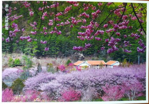 „This card shows Wuling Farm located in the valley area of Heping township, Taichung county, central Taiwan.“