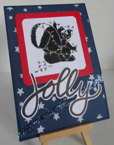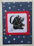 It’s such a cold weekend here – and I’m talking knitted socks, felt cardigan and woodburning stove cold – you hardly make it out of bed or off the couch and if you manage, the best thing to do is make Christmas cards. And go have a look at 17 (!) challenge blogs to see what’s up and get inspired. That’s how I came across the current Winter Wonderland Challenge: Christmas Decorations. And even though this card at first made me think of a skunk on its way to a 4th of July party, I did manage to give it a Christmassy twist.