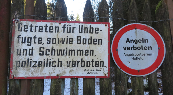 Unfortunately, you can’t get near the lake anymore, much less swim in it – unless you are a member of the fishing club of Hoffeld… even though the sign („No Fishing! The Fishing Club of Hoffeld“) makes you wonder about the true intentions of said fishing club 😉