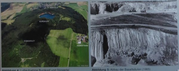 Mit am interessantesten fand ich, wie lange die Mechanisierung auf sich warten ließ. Bis zu 12m hohe Basaltsäulen wurden einzeln rausgebrochen… dann wiederum kein Wunder, dass der Abbau der ersten von insgesamt sieben Sohlen wohl länger gedauert hat, als der ganze Rest. Die Art der Nachfrage änderte sich zwar (von Basalt zur Herstellung von Grenzsteinen, über Wegebau, Gleisbettung und Pflastersteinen, dem Bau des Nürburgrings, dem Bau des Hindenburgdamms nach Sylt, dann auch des Westwalls hin zu Basaltschotter und Splitt für die quasi hauseigene Teermischanlage). 72m tief ist der entstandene Krater, der sich nach Stillegung mit Grundwasser gefüllt hat. Eine der Infotafeln zeigt diese Abbildungen: