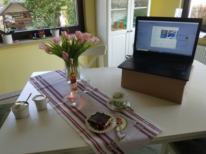 The weekend also featured a premiere: a virtual coffeeklatsch. Our meeting of 5 friends from high school takes place 5 times a year, always at another host’s. This time, obviously, a personal appearance was out of the question so we decided to do a video call instead – each with their own cake. It lasted for only about 2.5 hours instead of the usual 8 to 9 but the concept did work. Nevertheless, we are all looking forward to the next face to face coffeeklatsch again.