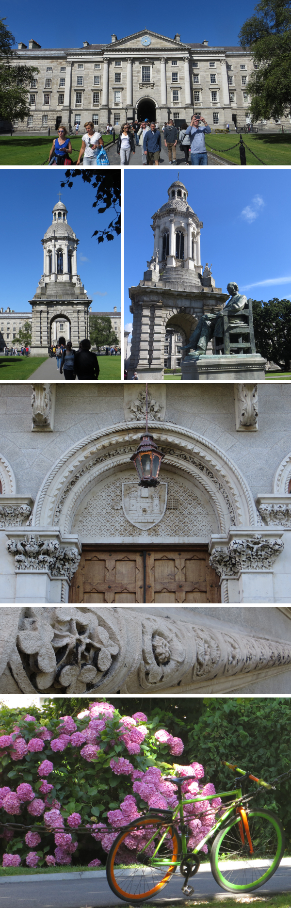 Just so you know: this post is extremely picture-heavy. It may have been only a day but I took pictures until the battery pack was dead. South of the Liffey again I headed for the campus of Trinity College, founded in 1592. You may envision it as a quiet and contemplative place and maybe it really is sometimes. But apparently not on a Saturday in July: hordes of tourists and large groups of students from all over Europe. But most of them only made it to the campanile – further in it grew much quieter.