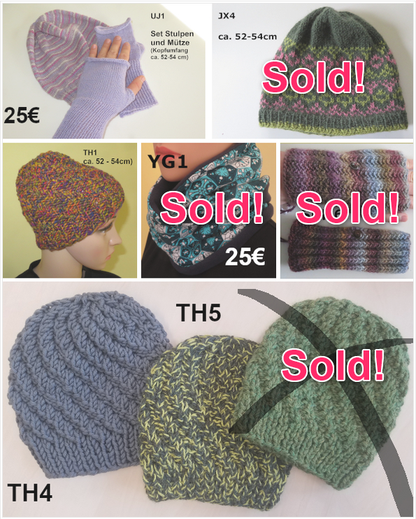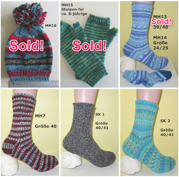 This past summer I was honored to facilitate a little coffeeklatsch for two nonagenarians: top sock knitter Johanna met with her friend Christel and recuited her for the good cause so that between the two of them, this is on offer (socks size 35 or larger and mittens 18 €, smaller socks 12 €, hats 15 €, scarf CH4 13 €, scarf JK12 20€):