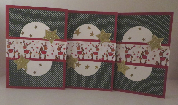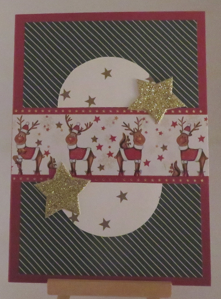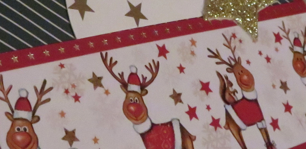 Sorry für die Qualität der Fotos… da habe ich irgendwie nicht aufgepasst. Jedenfalls handelt es sich hier um eine recycelte Weihnachtskarte vom letzten Jahr, die urspünglich drei dieser Motivstreifen mit den Rentieren hatte. Deswegen gibt es auch gleich drei Exemplare davon.