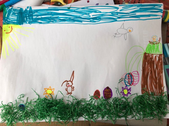 Bevor ich schließe gibt es aber noch österliche Kreationen aus dem Team U12 zu präsentieren, und zwar von Tobi und Anna, die sich einmal inspiriert von Jackson Pollock zeigen, ein anderes Mal den wahrscheinlich schicksten Osterhasen kreiert haben, der mir je untergekommen ist (mit Fliege!):
