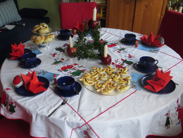 The open house mentioned above took place for the fourth time, though obviously at a new venue. Again, it had a lovely Christmas atmosphere but was different from the previous years as concerns attendance: there were 30 people ranging from 6 weeks to 91 years old from the neighborhood and the wider Cologne-Bonn area. The mulled wine was going quickly (but there was enough, phew) and the different cakes and cookies were eaten ravenously.